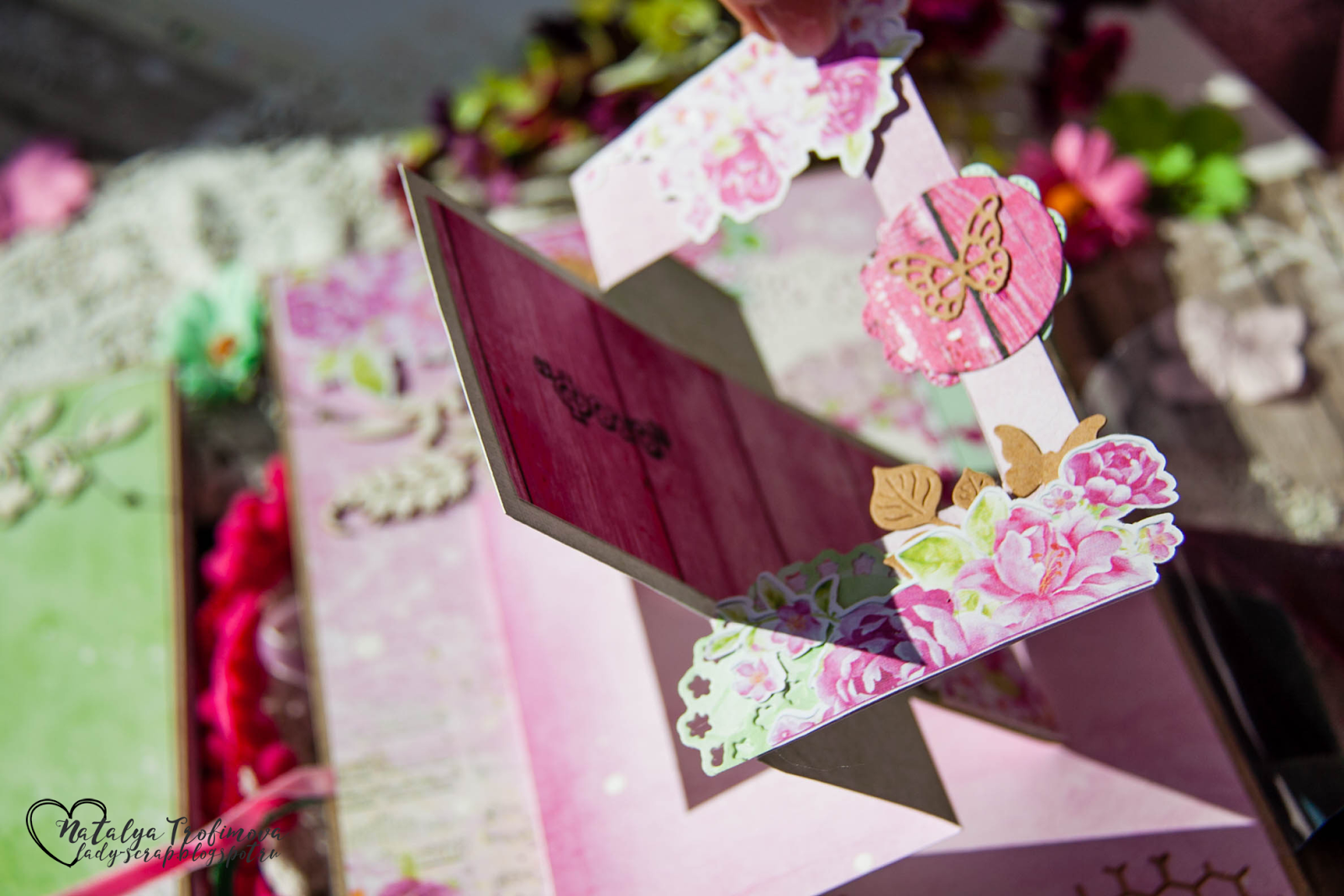 Я обожаю использовать прозрачную пленку. На этот раз она служит открывающимися элементами и дополнительно защищает бумажные высечки от повреждений. Кстати, на них также можно размещать фотографии.