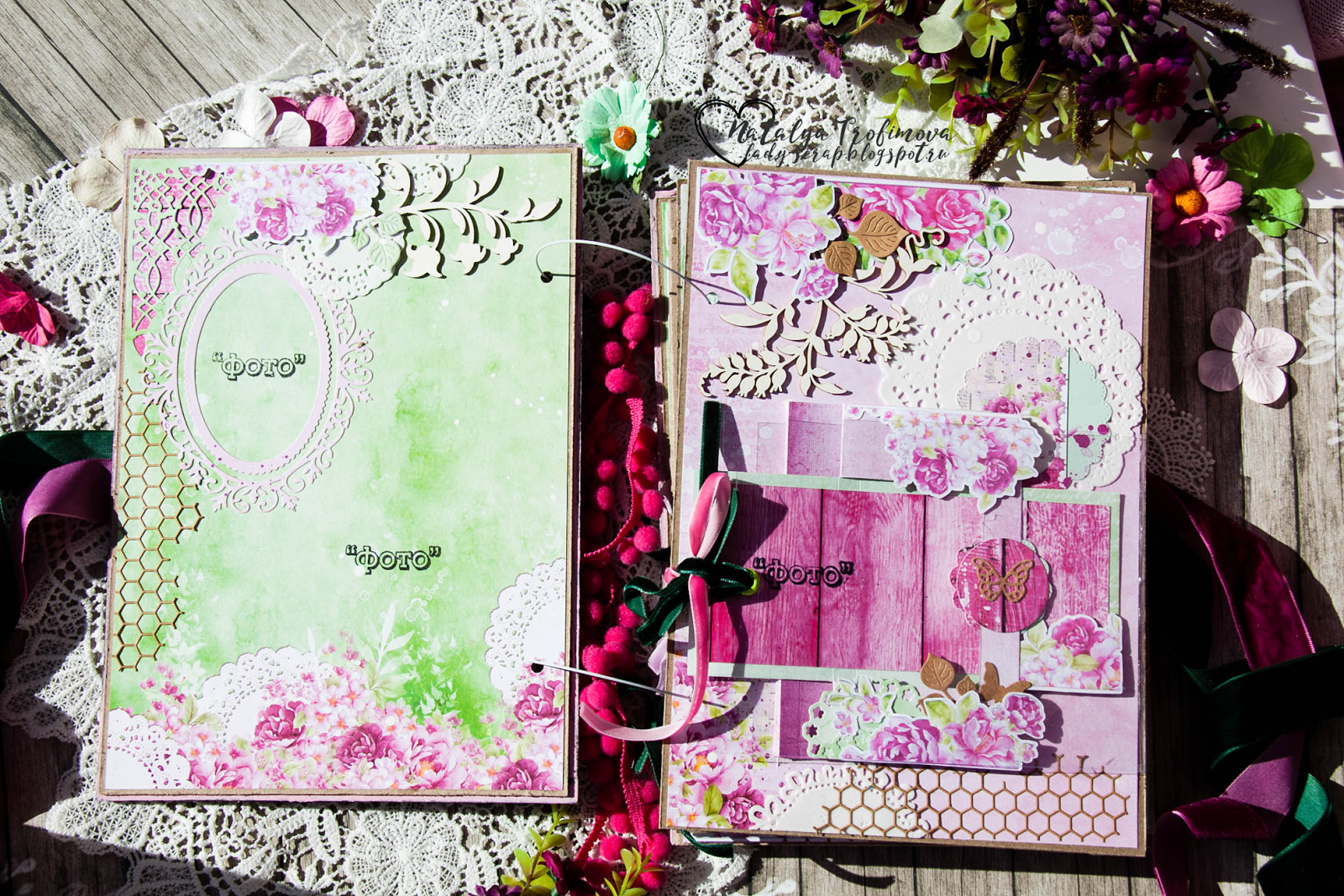 Как я уже сказала, обложка выполнена под доски с нуля с использованием переплетного картона. Текстура и фон создавала при помощи грунта, акриловых и кракелюрных красок, мха. На обложке я расположила свои самые излюбленные украшения: кружево, цветы, чипборд и вырубку. Завязывается альбом на потрясающие бархатные ленты.
